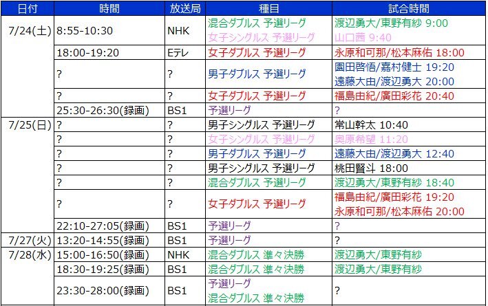 オリンピック放送予定 バドミントン / æ±äº¬ãªãªã³ã"ãã¯2020 ãããã³ãã³ ç«¶æç´¹ä» ææ¥æ°èãã¸ã¿ã« : 放送室 活動予定 お昼の放送、各種集会・学校行事の放送設営 小浜市障がい者スポーツ大会アナウンスなど コメント 放送部はあまり目立ちませんが、学校の運営を支えるなくてはならない部活動です。. バドミントン | スポーツテレビ局j sports(ジェイ・スポーツ)の公式サイト。豊富なコンテンツが満載です。j sports ならあなたの見たいスポーツ. Jun 21, 2021 · 東京オリンピックバドミントンの男子シングルス代表に内定した三豊市出身の桃田賢斗選手をたたえる懸垂幕が、21日朝、三豊市役所に掲げられ. 放送室 活動予定 お昼の放送、各種集会・学校行事の放送設営 小浜市障がい者スポーツ大会アナウンスなど コメント 放送部はあまり目立ちませんが、学校の運営を支えるなくてはならない部活動です。